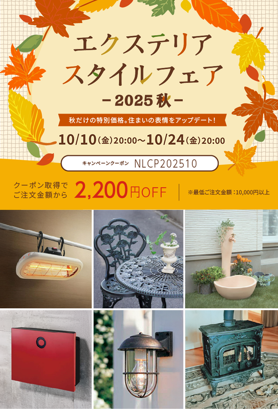 日頃よりfeel so niceをご利用いただき誠にありがとうございます。季節は秋。外空間を、もっと自分らしくアップデートしませんか?ただいま「秋のエクステリア・キャンペーン」開催中。10,000円以上のご購入で2,200円OFFクーポンをプレゼント。この機会に、ワンランク上のエクステ...